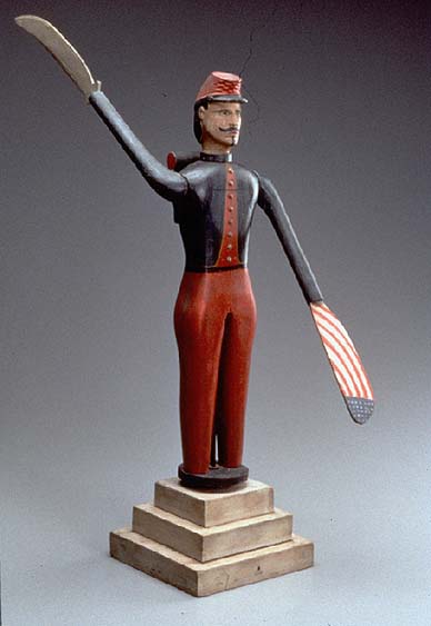 A patriotic whirligig (or wind toy) created by John Green Satterley (d. 1882), is a memento of the Civil War. The toy soldier wears the distinctive red-and-blue uniform of a New York regiment, and his swinging arms resemble a curved sword and an American flag. (left: John Green Satterley,Whirligig: Army Signalman, 1861-1865, 19 x 27 inches with arms extended, Gift of Maxim Karolik, MFA 58.1157)