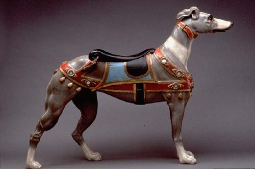 (right: Charles Looff, Greyhound Carousel Figure, c. 1905,