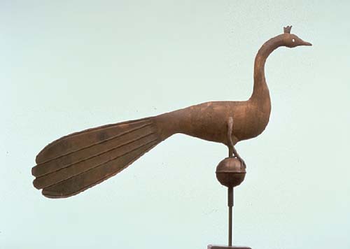 American Folk provides an overview of some 60 highlights from the Museum's permanent collection of American paintings, prints, furniture, textiles and decorative arts. This catalogue focuses on the variety and ingenuity of American folk art, and includes many large illustrations and an introduction addressing the nature of folk art. (right: Weathervane Peacock, copper, painted gold, iron rod, 15 1/2 x 28 inches, including base, Gift of Maxim Karolik, MFA 54.1089)