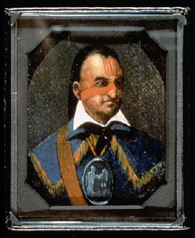 diplomatic missions. The sitter wears a silver peace medal, a medallion