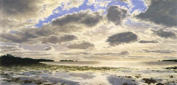 The timeless beauty of the Everglades and the imposing grandeur of the Atlantic Ocean and Gulf of Mexico also attract artists inspired by the Florida landscape. George Atkinson portrays the brilliant light of dusk and dawn breaking through the overcast skies of Florida's southwestern coast (North of Ponce Inlet and Everglades Mudflats). Rick Olson is best known for scenes of the Midwest and Florida, but has been inspired most recently to create soft focus images of Canyon De Chelly and Monument Valley. Charles Basham's rural vistas are inspired by the flat planes of Northeastern Ohio. Recalling the bucolic pastorals of George Inness, Basham draws the changing light, color, and moods of nature in America's Heartland.