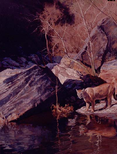 Artwork by 60 of the Society's members from the United States, Canada, Europe, South Africa, and Australia are included in the exhibit. Many of the world's preeminent wildlife artists are represented, including Guy Coheleach, Nancy Howe, Dan Ostermiller, Dine Paravano, Richard Sloan, and Kent Ullberg, among others. To capture their subjects, the artists use an assortment of media including oil, acrylic, gouache, watercolor, pastel, scratchboard, alabaster, and bronze. (left: Dino Paravano, Cougar Reflection, pastel)