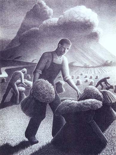 Wood adapted his style to the changing times. In Approaching Storm, he atypically referred to the harshness of the Midwest weather, a topic frequently used by fellow regionalist John Steuart Curry. Wood continued to reduce and simplify his subjects in the style of Seurat, making them appear sculptural.