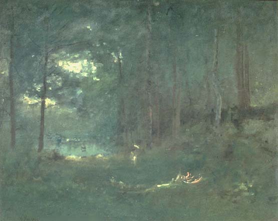 Tonalism, as exemplified by Inness's Summer, Montclair (New Jersey Landscape}, also recalled Whistler's harmonies and abandonment of naturalistic space. In contrast to Whistler's work, tonalism did not sever the emotional bond with the subject. However, it is due to its allusion to Whistler and his American heritage that tonalism provided a patriotic appeal and thus was deemed an American invention.[20] The tonalists' intimate, poetic canvases, which had never before been exhibited abroad as a group, contradicted the veristic Salon Machines in the conservative French galleries. Because brushwork reveals an artist's personality, critics interpreted it as a democratic, and therefore an American, trait. According to James Carroll Beckwith, who was not a tonalist but who exemplified a host of repatriated artists with analogous aims, "we are no longer groping for bizarre technique," but prefer "a wholesome, natural painter-like method of reproducing in an individual manner what is presented to us at home. [21]