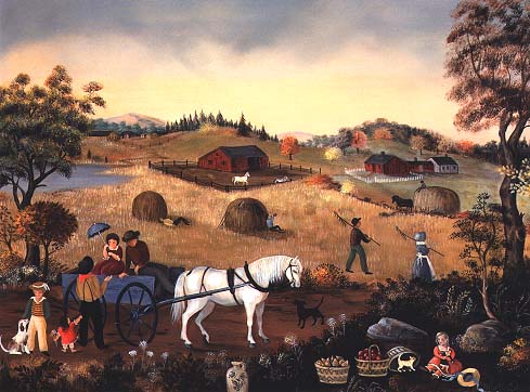 Representative of the fall season, Harvest is crammed with details suggesting abundance and a pleasant, mellow feeling. Two people in a horse-drawn wagon pause to talk to neighbors on the road. Meanwhile, their white horse - who almost seems to be smiling - passes the time of day with a black dog. Two men lounge by haystacks in the field. At the lower right, a scene-stealing vignette features a girl with a doll, baskets of fruit and a kitten.