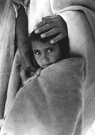 Bubley worked extensively as a freelance magazine photographer, producing photo-essays for Life and Ladies Home Journal. Bubley's "Backstage with Life" story featured behind-the-scenes views of popular entertainment. Her humorous photograph of an incredibly serious child performer lifting his brother and sister in Strong Man on Grand Chance Roundup (1951) demonstrates her special talent for photographing children. Bubley also produced photo-essays of Amencan families facing both everyday and extraordinary challenges. On view from the popular "How America Lives" series, published in Ladies Home Journal from 1948-1960, is the inspiring tale of the Rood family, who successfully paid off a 40-year farm mortgage in six years. This 1948 photo-essay included scenes from everyday life on the family farm, including Vera Rood bathing her young daughter in a makeshift bathtub in the kitchen, and the elder Rood children performing their daily chores. (above right: Moroccan Girl, 1953, gelatin silver vintage print, 11 x 14 inches, photograph by Esther Bubley, Courtesy of the Beaux Arts Alliance)