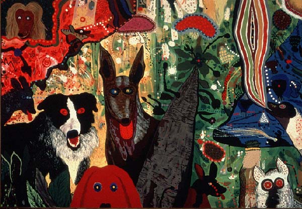 with wild-eyed dogs cavorting in brightly-colored, crazy-quilt jungles;