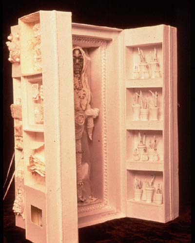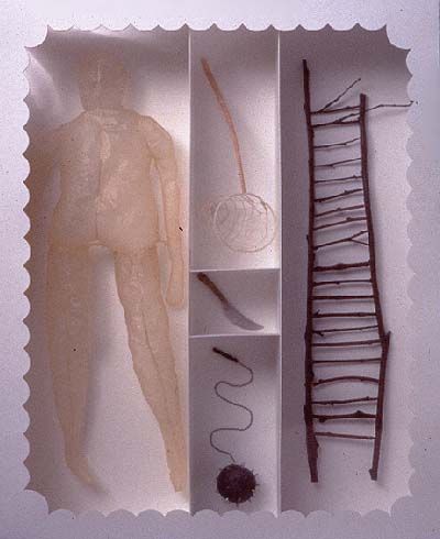 The aesthetic and creative freedom which the box gives to an artist is one of the reasons why art in boxes can be so successful. Boxes can be decorated inside and out, in the form of a diptych with a hinged center, a frame for intriguing stop action scenes, or filled with historic, nostalgic, and personal material.(left: Deborah Fisher, New Skin with Accessories, 1999, mixed media, 2.5 x 10 x 12.75 inches)