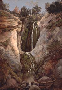 The earliest image in the exhibition is a small lithograph of 1836 by John Hall Esq. entitled "Santa Barbara--Upper California." It depicts a Chumash Indian in his canoe paddling along the coast with the Santa Barbara Mission, the Presidio, and the Santa Ynez Mountains in the background. The most recent is an oil painting by Santa Barbara painter Ray Strong, called "Season's Change, Buellton." (right: Henry Chapman Ford (1828 - 1894), "Cascade at Bartlett's Glen (Bishop's Ranch), Goleta Valley," c.1874, oil on canvas. Lent by Eric Hvolboil.)