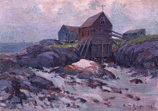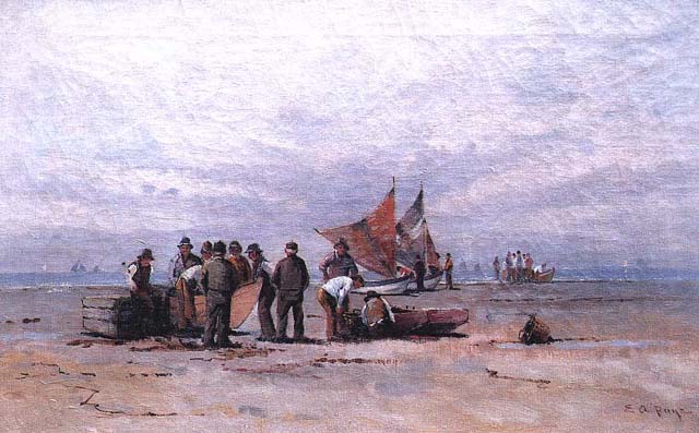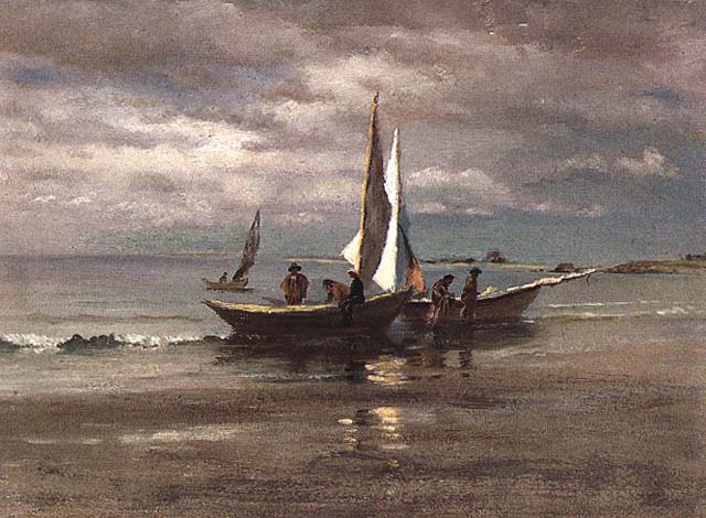From left to right: E. A. Page, Counting the Catch, oil on canvas, 14 x 22 inches, Neil Rossman Collection; C. E. L. Green, Fishing Shacks at Swampscott, oil on canvas, 9 x 13 inches, Neil Rossman Collection; William Bradford, Lynn Beach, oil on canvas, 10 1/2 x 19 3/4 inches, Lynn Historical Society; William Partridge Burpee, Dories on Lynn Beach, c. 1890s, oil on paper, 11 3/8 x 16 inches, Private Collection, Courtesy Childs Gallery.