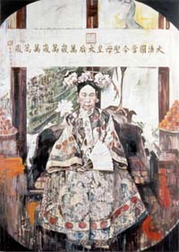 She thinks of her paintings as simultaneous destructions of and creations from the photographs. After studying the photographs to "look under" them, Ms. Liu uses paint to dissolve them, allowing the present to address problematic issues in recent Chinese history while also looking for bonds, similarities, and, ultimately, resolution. She often takes a step further by surrounding the photography-based images with traditional Chinese motifs such as Buddhas, lotus blossoms, and others that seem to have come directly from ancient Chinese scrolls. In this way, Ms. Liu has tied her art to the greater tradition of Chinese art, while creating works that could only have been made within the contemporary world of American art.