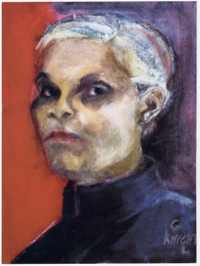 Knight, who turned 90 this year (2003), has continuously explored portraiture, the figure, and details of domestic life as subject matter for her work. She and her late husband, painter Jacob Lawrence, were surrounded by a rich mélange of academic and artistic activity throughout their life together, beginning in the cultural renaissance of Harlem and, since 1971, in Seattle where Lawrence taught at the University of Washington. (left: Gwen Knight, Portrait of the Artist, 1991, oil on canvas, 20 x 16 inches, MoNA promised gift, Marshall and Helen Hatch Collection)