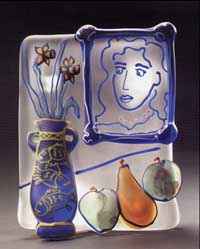 Line Drawings (1985-90): Jolley's interest in exploring sculptural volume is evident in the rounded forms of elegant figures in clear glass whose features are defined by delicate blue lines. Extraneous formal and narrative elements are gradually eliminated to emphasize the classical purity of the human figure.