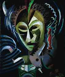 William H. Johnson, who studied in New York City and Paris, changed from impressionism to a flat, consciously naïve style in the late 1930s, when he began to focus on African American subjects. In Café (about 1939-40), Johnson used modernist flat colorful forms in a humorous portrayal of a smartly dressed couple in a Harlem café. (right: Lois Mailou Jones, Les Fétiches, 1938, oil on linen, Smithsonian American Art Museum, Purchase made possible by Mrs. N. H. Green, Dr. R. Harlan, and Francis Musgrave)