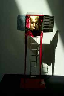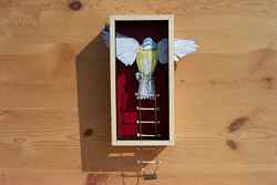 Privitt has been featured in several printed publications, including Sculpture: Technique, Form, Content by Art Williams (Worcester, MA: Davis Publications, 1988); and The California Art Review, edited by Les Krantz (Chicago: American References, Inc., 1989).(right: "Flee as a Bird" refers to an old church song written in a minor key. The "ladder" hanging below is made of bird bones,16 x 9.25 x 2.75 inches)