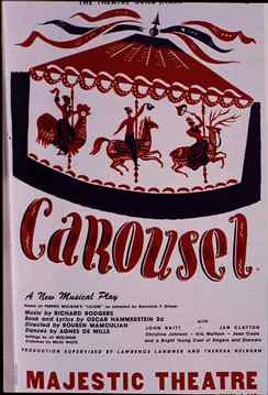 Later sections highlight the milestone season of 1927-1928, when over 50 musicals lit up Broadway; in that same year, Jerome Kern and Oscar Hammerstein's collaboration on Show Boat set precedents for the modern musical's artful fusion of story, song and spectacle. (right: Window card for Carousel, 1945 Credit: Courtesy Triton Gallery, New York City)