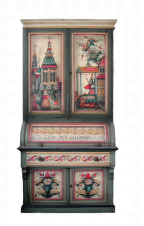Two highlights of the show are pieces that Ralph Cahoon decorated with elaborate designs based on Swedish wall hangings. In one case, the main panels on a Victorian walnut secretary illustrate the biblical story of King Solomon and the Queen of Sheba. In the second, images on a 6-foot-long pine dowry chest exuberantly tell the tale of the Prodigal Son.