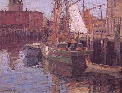 Upon returning to the United States, Mulhaupt took his first trip to Gloucester in 1907. His technique had matured considerably in the previous years, and in the harbors of Cape Ann he found a visual tableau of light, color and texture that he had been waiting for all of his life, as he had once described that Gloucester "duplicates any views I care to paint."[18] From then on, Mulhaupt spent most of his summers in the region, exhibiting at the Gallery-on-the-Moors in five of the first seven exhibitions. He was also a founding member of the North Shore Arts Association. By 1923, no other areas could lure Mulhaupt away, and he settled in Gloucester, eventually buying a former blacksmith's shop on Rocky Neck where he painted year round, despite the lack of running water in the winter.