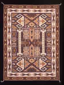 Navajo weavers are intimately aware of their weaving tradition and articulate regarding their thoughts on design and cultural concepts. Tiana Bighorse explains, "Nowadays there is lots of different kinds of design. But I still remember those old designs that my mother used to make. I like to weave these designs so they will not be forgotten." Another Navajo weaver provides insight into one of the misunderstood weaving practices known as the "weaver's pathway," a mysterious line that sometimes crosses through the border to the edge of a rug. She relates: "Some people just weave and weave and weave all the time. And sometimes they think they might just weave their life away. So they put that line in so they can escape. Or they think they might weave themselves into the rug. And they put the line in so they can get out." (right: Roselyn and Hilda Begay, Teec Nos Pos (1978), 64.5 x 88 inches. Farmington Museum, Kathy Foutz Collection)