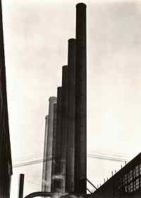Born in Highland Park, Illinois, Weston (1886-1958) discovered photography in his youth with a camera given to him by his father. He began his professional career in Southern California in the early 1900s as a surveyor for the railroads. After a brief period of study at the Illinois College of Photography, he returned to Southern California in 1908 and became a founding member of the Camera Pictorialists of Los Angeles. He married the next year, depicting his new bride, Flora Chandler, in a striking study (perhaps Weston's first nude), which is included in the exhibition. In 1911, he opened his own studio. He supported his family for 10 years through commercial photography while pursuing his artistic interests on the side. (right: Edward Weston, Armco Steel, Ohio, 1922. Gelatin silver print. ©1981, CCP, Arizona, Board of Regents)