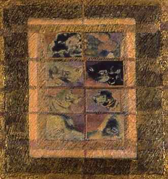 'prints' embellished with painting, drawing, stitching, and collage. (right:
