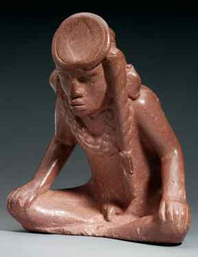 (above: Effigy Pipe of a seated male figure; known as the Resting Warrior and identified as Morning Star or Red Horn in related legendary accounts; Oklahoma, LeFlore County, Spiro, site 34LF46; 1100-1200 A.D.; flint clay; 8 7/8 inches; University of Arkansas Museum, Fayetteville)