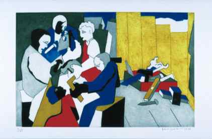(above: Jacob Lawrence, American (United States), 1917-2000, Five Builders with Tool Box, 1996, soft ground etching and aquatint on paper. Gift of Dr. James and Vivian Curtis, 2000/2.125. © 2005 Gwendolyn Knight Lawrence / Artists Rights Society (ARS), New York)