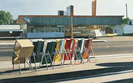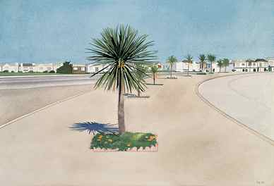 Bechtle's paintings emphasize Northern California residential neighborhoods -- replete with stucco houses, repetitive rows of palm trees and the ubiquitous parked car. Bechtle's preference for wide, empty spaces; his flat, sunbleached palette; and his detached mode of recording detail impart a certain sense of alienation to his frequently banal subjects. The comprehensive exhibition includes works, such as the extraordinary '60 T-Bird , 1967-68, an iconic image from Bechtle's early group of car images. This painting features the artist's brother standing proudly beside his virtually perfect white coupe with gray tires appointed with white stripes.