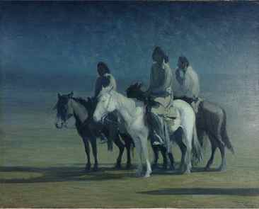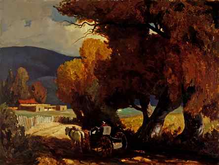 With the intent to visit Santa Fe briefly so as to paint for the Santa Fe Railway, Edgar Alwin Payne extended his visit to New Mexico for four months. During his stay Payne sketched and painted throughout the Navajo Reservation, most notably Indians Under Spiderwoman Rock. The results of his close observations of the land and its inhabitants are highly textured paintings with loose brush strokes.