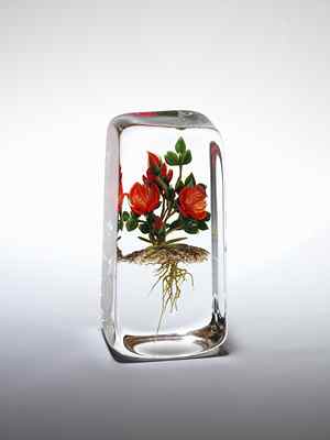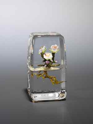 The intensity and intimacy of Stankard's floating worlds reveal his deep interest in nature's cycles and patterns, spirituality, and mystery. The careful observer gradually notices in his paperweights miniscule words and tiny figures entangled among the plant roots that symbolize for the artist the vital forces that flow through all living things. He strives for "organic credibility" by constantly experimenting to find correct colors or special techniques that allow him to capture the beauty of flowers with an artist's sensibility and a poet's awareness of a deeper meaning.