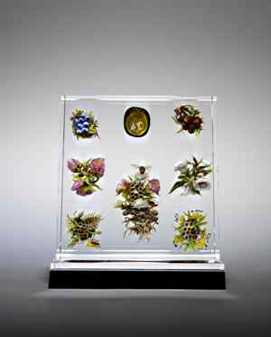 "In Stankard's world-renowned glass art, nature is crystallized," says David Revere McFadden, chief curator of the Museum of Arts & Design, New York, which organized A Floating World. "With amazing technical skill, the artist creates flowers and insects that rival the perfection and diversity of nature by melting and manipulating colored glass rods in the lampworking process, and then encasing them in glass crystal. The magnifying effect of the crystal brings out every intimate detail, from the fuzz on the inside of a petal or bumblebee's body to the fine sheen on a dragonfly's wing, demonstrating Stankard's acute powers of observation and exceptional artistic sense."