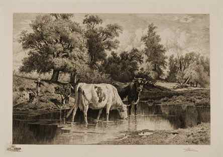 Mary Nimmo Moran was distinguished for etching en plein air, taking her copper plates to picturesque sites in the Hamptons. Her "Where Through the Willows Creaking Loud, is Heard the Busy Mill" (1886) is a calm scene, with a summer breeze seeming to stir the lush, detailed foliage. The overwhelming abundance of nature dwarfs several small figures along the river's edge and windmills in the distance. Peter Moran's Summer Time (c. 1887) also depicts a subdued landscape in which carefully rendered cows drink from a stream.