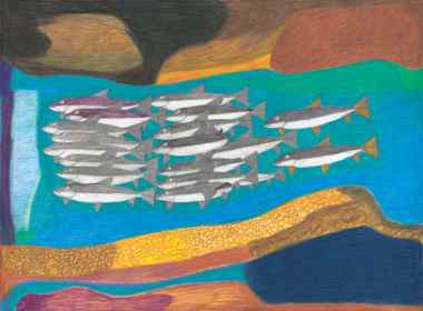 Initially, the drawings were just a means to an end, a potential model for a print. But in recent decades, Inuit drawings have come to be appreciated and collected as self-sufficient works, especially those by artists such as Janet Kigusiuq and Annie Pootoogook, both of whom are seen in Forms of Exchange. Drawings tend to be more complex and experimental, as in Kigusiuq's lovely Nineteen Fish, in which the artist uses vibrant color pencils to create an intriguing combination of aerial and sidelong views. She accentuates the width of the composition to enliven her subjects, who swim in an environment glowing with brilliant, radiant hues -- Kigusiuq's work represents Inuit art at its most daring.