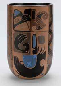 Pottery making began in the Southwest about 200 C.E., and by 1100 C.E. the ancestors of the Pueblo people -- at the height of their civilization prior to Western contact -- produced fine wares that displayed bold, black-and-white geometric designs. By the fifteenth century, the Hopi village of Sikyatki created an iconography of stylized birds' wings and swirling arabesques. Later Pueblo potters admired and imitated these ancient traditions, especially after the pottery revival of the early twentieth century. This revival helped Pueblo people (so named after the Spanish word for village) bring prestige and much-needed financial support into their communities during a time of disruptive modernization. Potters from the Acoma, Hopi, San Ildefonso, and Santa Clara Pueblos were instrumental in establishing their work as a fine art, both by reinvigorating contact with long-standing pottery-making traditions and through unprecedented innovations.