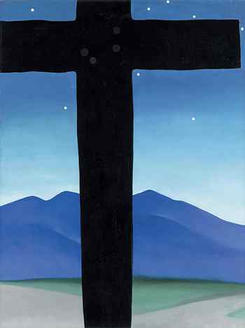 The landscape near Taos, New Mexico, lured and inspired photographers Paul Strand, Edward Weston, and Eliot Porter, along with painter Georgia O´Keeffe. Strand´s Buttress, Ranchos de Taos Church, New Mexico (1930) and O´Keeffe´s Black Cross with Stars and Blue (1929), which capture the intersection of culture and landscape, are among those shown. In their works Black Place III (1944) and Black Place, New Mexico, September 1945, O´Keeffe and the photographer Eliot Porter interpret the remote gypsum hills in strikingly modernist compositions. (right: Georgia O´Keeffe, American, Black Cross with Stars and Blue, 1929, oil on canvas, Mr. and Mrs. Peter Coneway © The Georgia O´Keeffe Foundation / Artists Rights Society (ARS), New York)