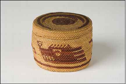 (above: Makah lidded box, Makah, Northwest Coast, Olympic WA, 19th century, 3 h x 4 d x 13 _ c inches, Shallow circular lidded box, crescents on lid, natural and dyed grasses. Bruce Museum collection 20940)