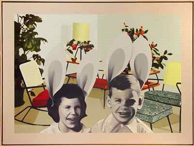 "Adventures in a Temperate Climate" explores the artist's recent work and his complex and ironic view of his Midwestern roots. In the accompanying catalogue, Glen Helfand describes Mull's new body of work as images that "tell the story of an American life, that of one child who was raised in a specific time and place. He lived in a Midwest informed by MGM's fantastical Kansas, one of many Hollywood-created landscapes filled with iconic visual and narrative elements aimed to convince an entire country that there's no place like a Caucasian middle class home."