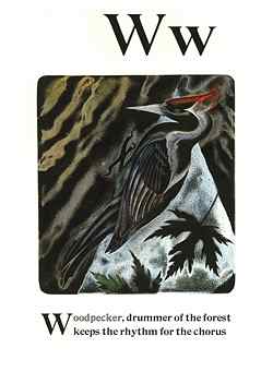 (above: Brian D. Cohen, The Bird Book, 2004, The Letter W, 15 x 11-14 inches, Hand-colored relief etchings by Brian D. Cohen, printed on Somerset Book Wove paper. Rhyming couplet by Holiday Eames)