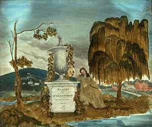 (above: Memorial Sampler, c. 1825, Attributed to Mary Ann Cowan, Collier Township, St. Joseph's Academy Maryland, Silk, chenille, paint and ink on silk, 19 _ x 23 inches. Collection: Mrs. Robert (Elizabeth) Dickey, III Photography: Mark May Photography