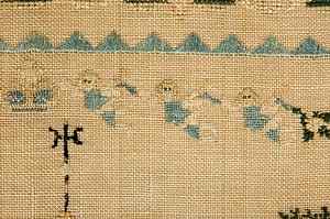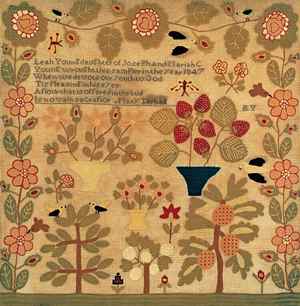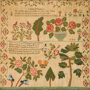 Lizzie's sampler is the latest known Tidball School sampler, but retains the design and quality of work characteristic of that school.)