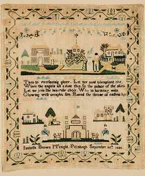 Isabella may have been related to the McKee family of Pittsburgh, but nothing else is known about her other than the information recorded on her sampler. The wonderful drapery of angels above the upper panel (see detail) illustrates the embroidered verse: "Where the Angels all Adore Thee, in the Palace of the Skies." The figures and structures in the lower panel appear to be generic. The crowned lions suggest an English sampler as the design source for the lower panel, but there is an American flag above the castle. School buildings also appear in the work of at least two other Allegheny County schools: the Edgeworth Seminary and the Star School.)