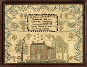 Three samplers are so similar that they were clearly worked under the direction of the same unidentified teacher (cat. 1113). The school is referred to here as the "Star School" because of the cluster of seven starlike devices above the brick house, or school, on each sampler. They are attributed to Allegheny County based on genealogical information.