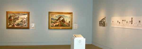 (above: Image of the gallery containing the exhibition. To the left is Thomas Hart Benton, American, 1889-1975, Engineer's Dream, 1931. oil on canvas, Signed: lower left, 29 7/8 x 41 3/4 inches (75.9 cm x 106 cm). Eugenia Buxton Whitnel Funds 75.1. To the right is Thomas Hart Benton, American, 1889-1975, Wreck of the Ole '97, 1943, egg tempera on gessoed masonite, 20 x 25 inches, signed and dated lower left. Gift of the Benwood Foundation.)