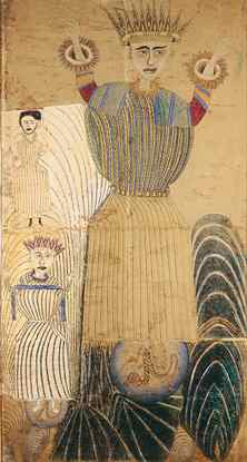 The religious figure that most likely inspired these Madonnas is Our Lady of the Immaculate Conception as represented in the artist's home parish in Capilla de Milpillas. Her iconic attributes, both traditionally Mexican and Catholic, include a globe on which she is standing, with a snake swirling at her feet. Ramírez's renderings nearly always have the figure's arms raised (in sublimation, in praise), frequently with a blue cloth stretched between them. With few exceptions, the Madonnas wear heavily textured and ornamented robes with dense designs that recall sheaves of wheat. They also sport huarache sandals indigenous in style to the artist's homeland. Ramírez crested each of his Madonnas with a crown, which breaks from traditional attributes in depictions of Our Lady of the Immaculate Conception; it is perhaps a borrowed image from another revered Mexican saint, the Virgin of Guadalupe. Other than this one departure, Ramírez was unerringly faithful to traditional depictions of this religious figure, and the painting of her hanging above the altar in his home church.
