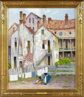 Like many subjects depicted by artists working in the south, wash day provides the backdrop for an exploration of real people's lives. These images are both a record of events and an idealization of simple domesticity. Alfred H. Hutty, one of the most recognizable of the Charleston Renaissance artists, often chose to include laundry lines and black servants in the scenes he painted of the alleys between the grand houses and service buildings in Charleston. (fig. 8) Aiden Ripley's "Wash Day Charleston" (fig. 9) portrays a more racially diverse scene with two white women and a black woman and child all working together in the area behind the house. As beautiful as it often is, imagery of wash day is a symbol of the complexities of class race and culture. Corrie McCallum, co-founder of the Charleston school of art with her husband, fellow artist William Halsey, chose to depict the front of a house on St. George street (fig. 10) rather than the concealed workings of the household. Her modernist study was most likely conceived with issues of line and color in mind rather than the social implications of laundry hanging on the porch. Even so, it bears a message. This neighborhood was perhaps poor enough that there was no need to conceal the washing or there was no where to do so.
