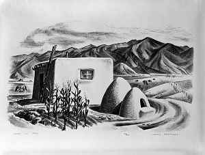 (above: Jerry Bywaters (1906-1989), House in Taos, 1939, Lithograph. Edition number: 24/24. Jerry Bywaters Collection of Art of the Southwest, Hamon Arts Library at SMU, JB.86.10)