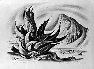 Bywaters frequently used the same image for both his prints and other works, including drawings, paintings, pastels and watercolors. He grouped his preferred images together and printed them at a later date when he had access to printing facilities. An example can be found with his 1939 lithograph In the Big Bend, in which Bywaters depicted the graceful lines of the yucca plant flowing into the harsh mountain ridges. In the same year he worked the image into his painting Century Plant, Big Bend. Since the painting will be part of the parallel exhibition "Jerry Bywaters: Interpreter of the Southwest," viewers may compare both the print and the painting side-by-side. Between the two exhibitions, visitors will be able to compare and contrast five examples of the artist's treatment of the same or similar subject matter with different media.