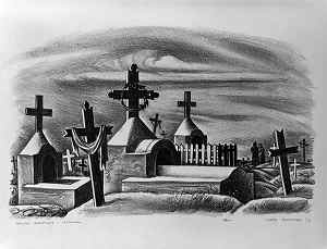 (above: Jerry Bywaters (1906-1989), Mexican Graveyard - Terlingua, 1939, Lithograph. Edition number: 19/22. Jerry Bywaters Collection of Art of the Southwest, Hamon Arts Library at SMU, JB.86.16)
