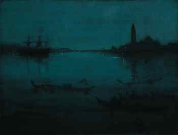 The larger-than-life Whistler hardly seems to be someone who would wield a soft brush. Infamous for his cantankerous behavior and his libel suit against art critic John Ruskin, in Whistler's art one sees his softer side. He once stated, "Paint should not be applied thick. It should be like breath on the surface of a pane of glass." The result of this counsel is a body of contemplative and meditative paintings that, like the mist of breath's condensation on a pane of glass, appear on the canvas without evidence of the artist's hand. Whistler's Nocturne in Blue and Silver - The Lagoon, Venice (1879-1880, Museum of Fine Arts, Boston) is a striking example of how painting softly capitalizes on the power of suggestion over description. Inspired by evening strolls along the Thames, damp with London fog, paintings like Nocturne in Blue and Silver (1872-1878, Yale Center for British Art, New Haven, Connecticut) seem to be made of mist themselves, the ghostlike river bank dissolving into the canvas.