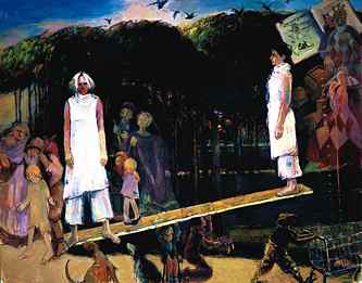 One could argue that this exhibition of paintings, drawings and sculpture has been in the works since she was a three-year old in 1929. Here, Elaine Badgley Arnoux shares her personal political and social dreams -- and nightmares -- for the United States. The themes of the paintings and sculptures include economic depression (Ride a Cock Horse to Banbury Cross); the Holocaust (The Pied Piper of Hamlin); overpopulation and material excess (Old Woman in the Shoe); economic and social imbalance (See Saw Margery Daw); September 11, 2001 (The Old Woman Who Went up in a Basket to Sweep the Sky and The Fox Went Out One Chilly Night); the brutality of power; (For Every Evil) and a belief in the native goodness of the people of our country (Hope).